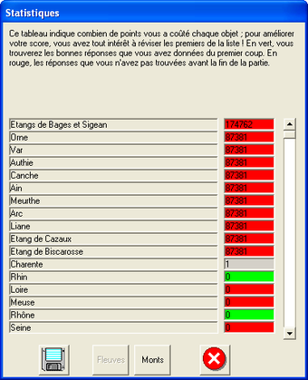 Grâce à ce petit software sans prétention, les fleuves, rivières, lacs et montagnes de France n'auront bientôt plus de secrets pour vous. Face à la carte hexagonale, placez les différents lieux que vous indique le jeu en faisant le moins de fautes possible. Et ce n'est pas si facile.